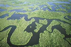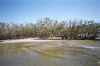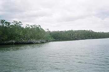 trees rising out of coral reefs, oyster beds, and sandy shoals. The area lies